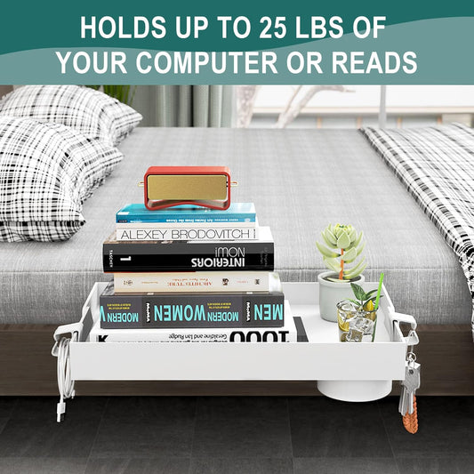 Folding Bedside Shelf with Cupholder, Clip-On Bedside Table, Nightstand Hanging Tray, Caddy Organizer for Bed & Bunk Bed, College, Dorm, Loft, Bed Essentials, White