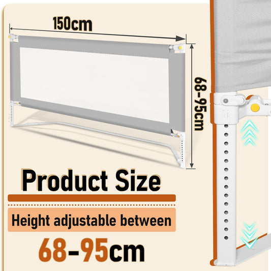 Bed Rail Fall Protection, Foldable Bed Guard Rail with U-Shaped Feet, Children's Bed Rail Height Adjustable from 68-95 cm, Baby Bed Rail with Airy Mesh, Easy to Install