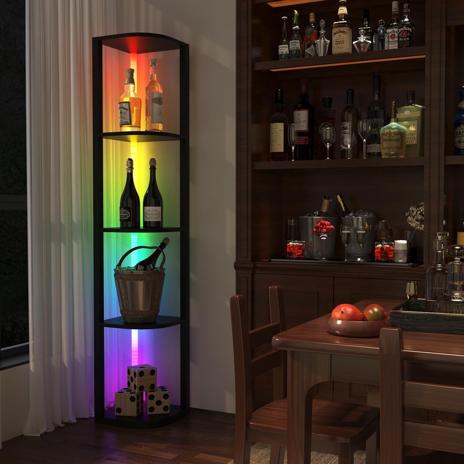 【Multiple Colors + Adjustable 6 Color Temperatures】This display cabinet with lights has multiple brightness modes with red, orange, yellow, green, blue, purple, and other colors. You can switch between modes and colors as you wish. Additionally, there are six color temperatures to choose from, ranging from 2700K warm light to 6500K white light. These dimmable corner shelves with lights can be used to decorate the room and place ornaments, offering a dynamic lighting experience.